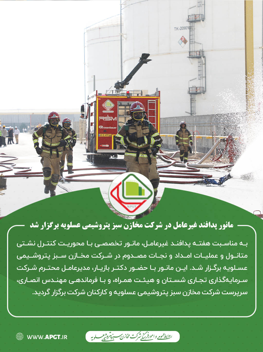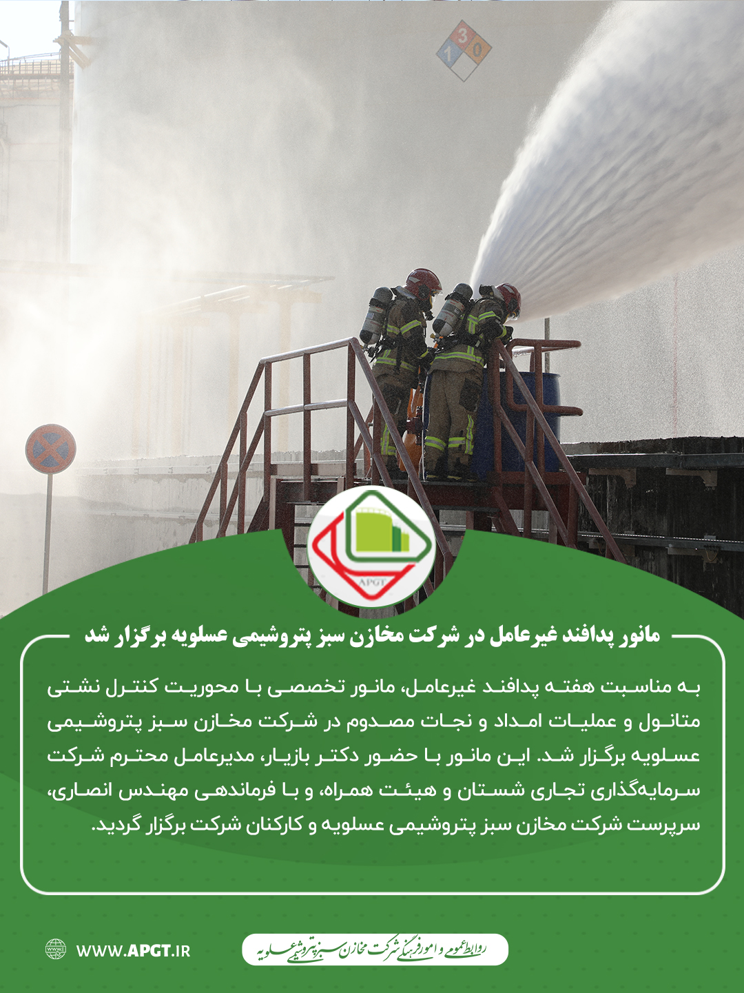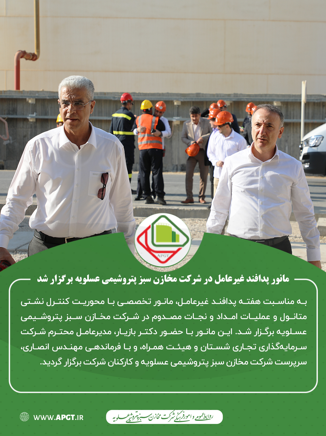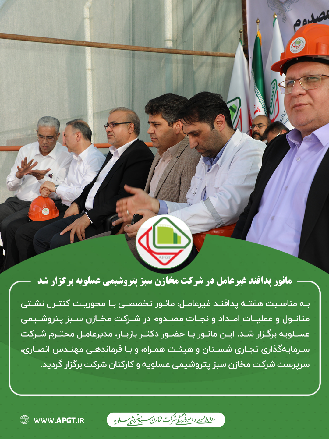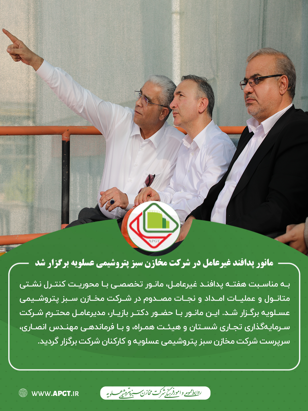 مانور جلوگیری از نشت متانول و امداد و نجات مصدوم با حضور دکتر افشار بازیار مدیرعامل شرکت سرمایه گذاری تجاری شستان و به همت شرکت مخازن سبز پتروشیمی عسلویه در شهرعسلویه برگزار شد.