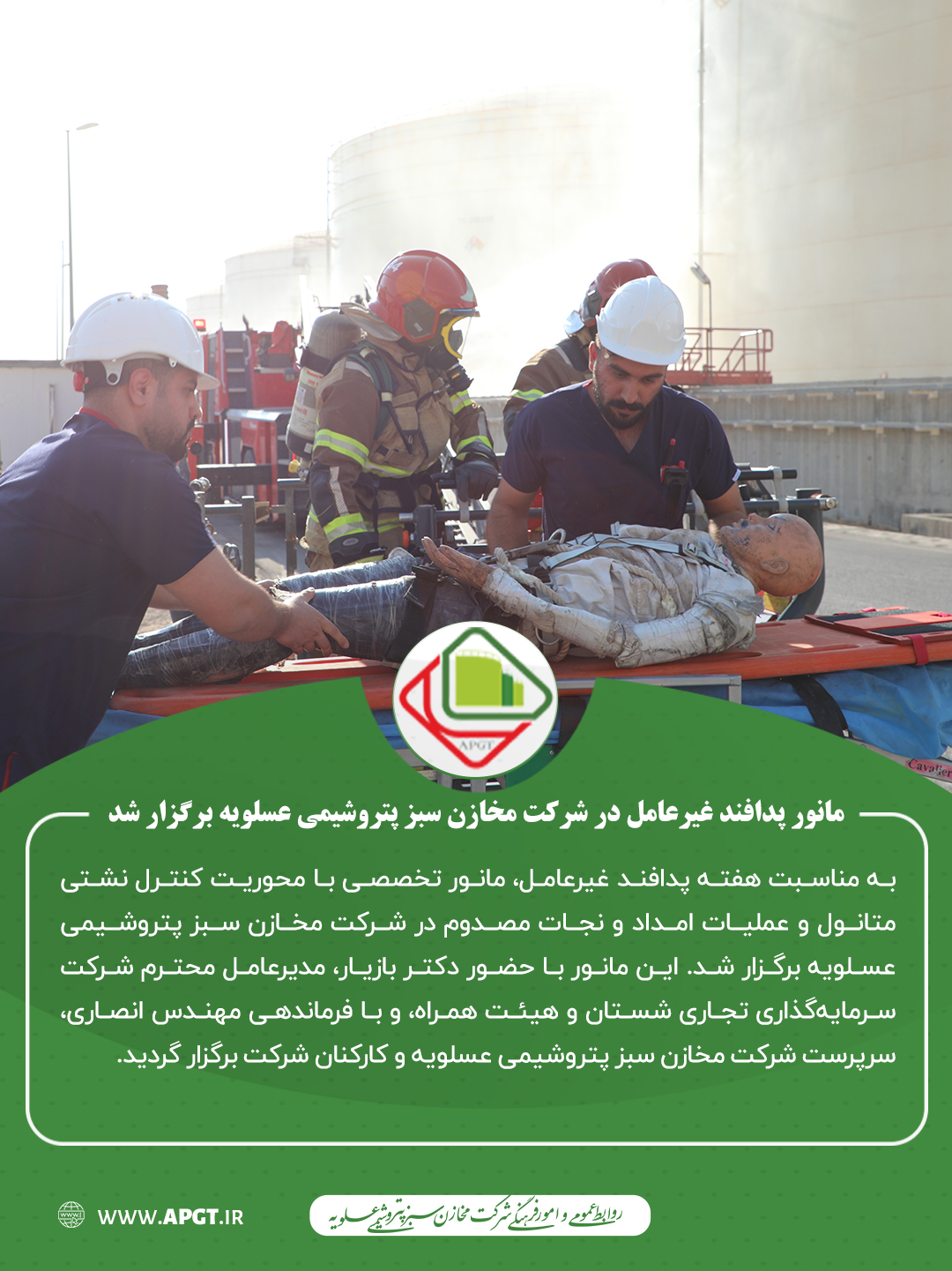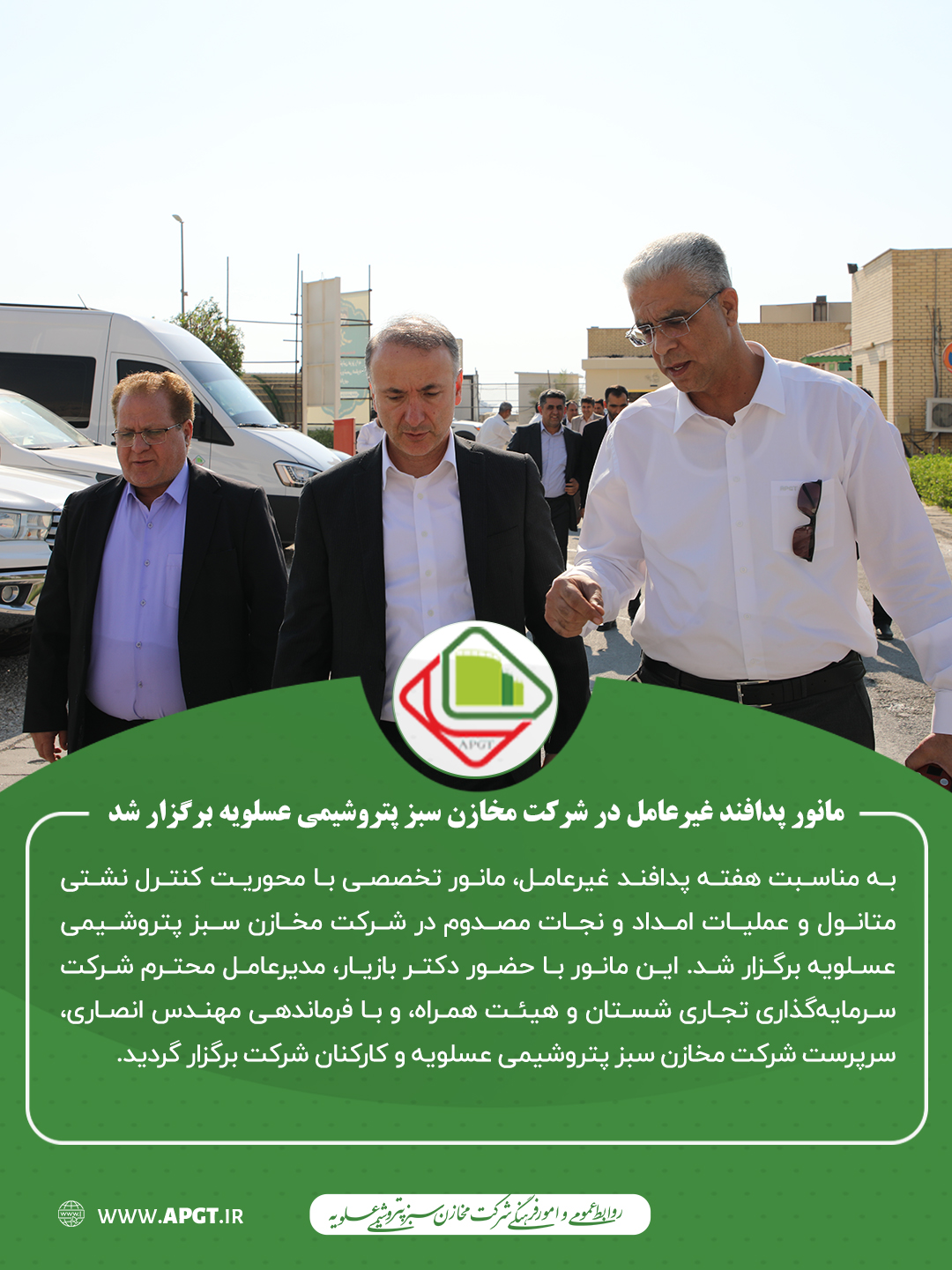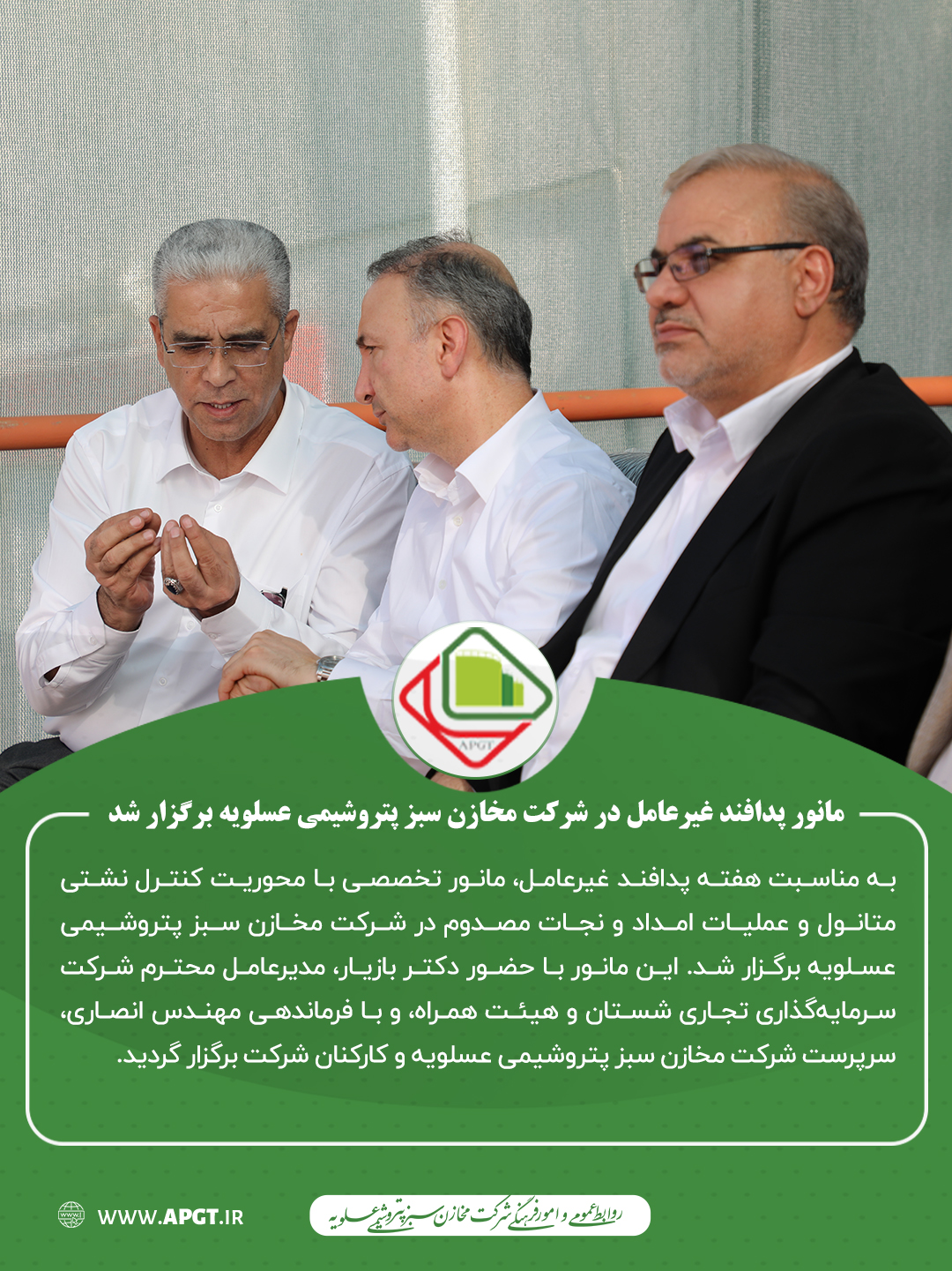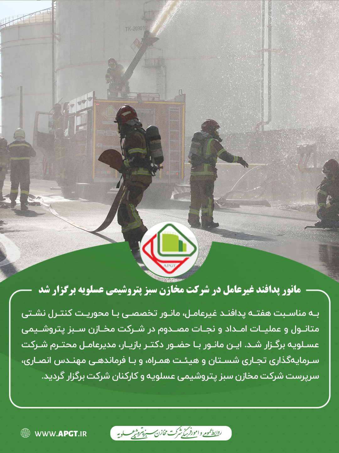 مانور جلوگیری از نشت متانول و امداد و نجات مصدوم با حضور دکتر افشار بازیار مدیرعامل شرکت سرمایه گذاری تجاری شستان و به همت شرکت مخازن سبز پتروشیمی عسلویه در شهرعسلویه برگزار شد.