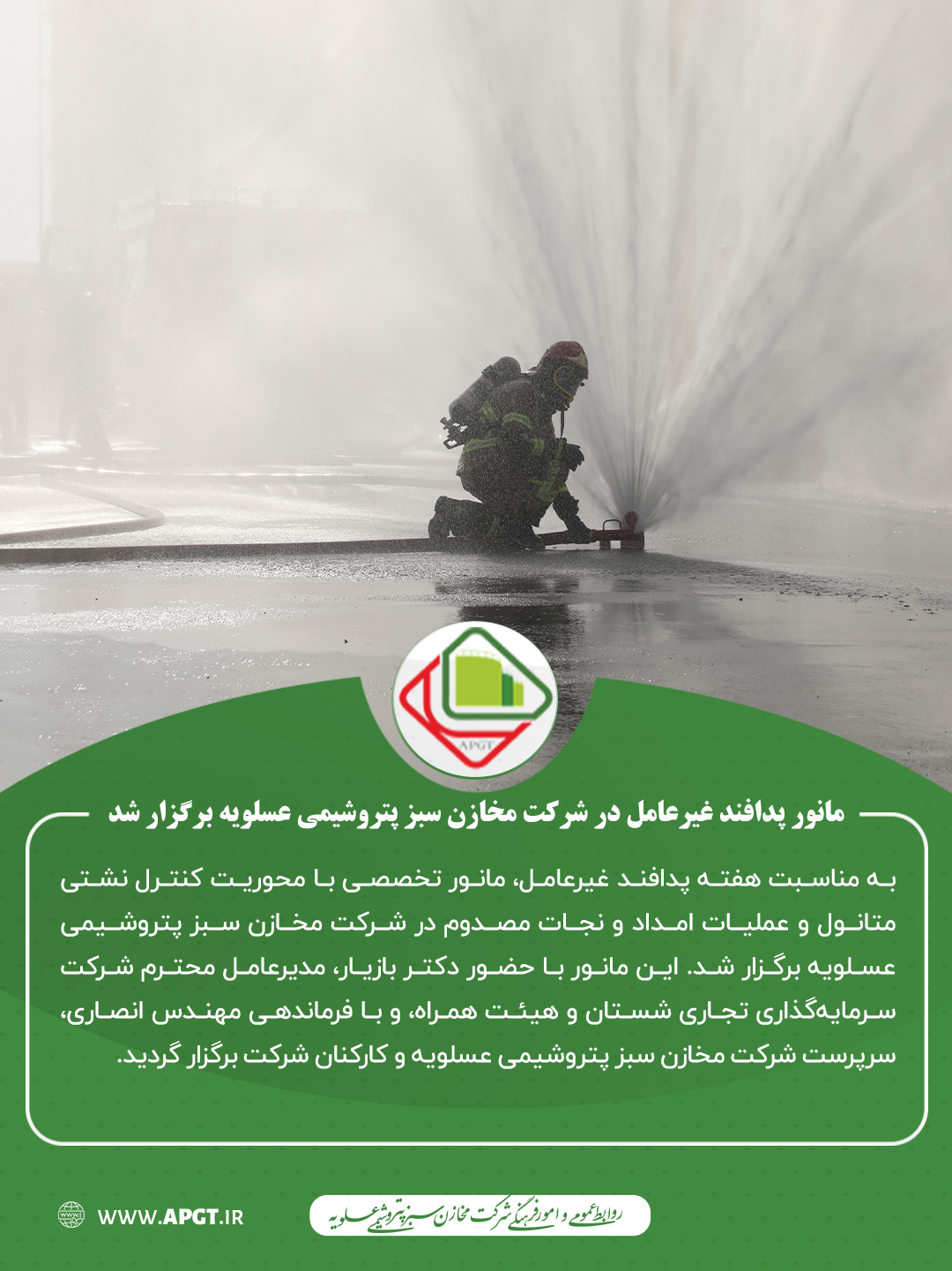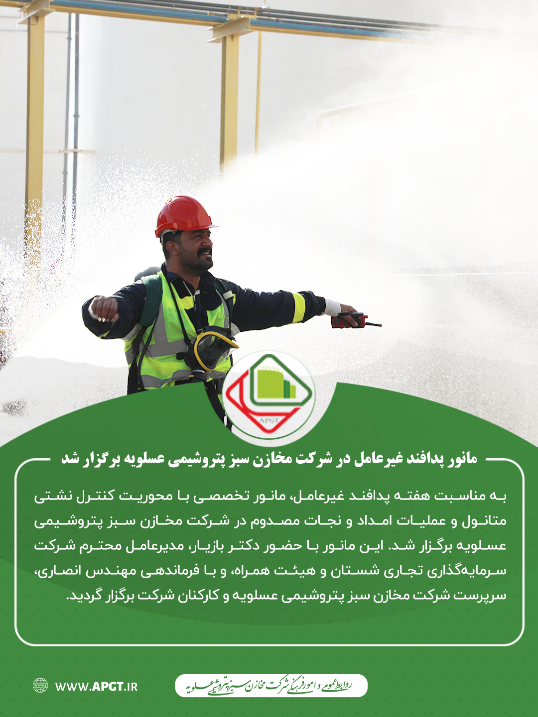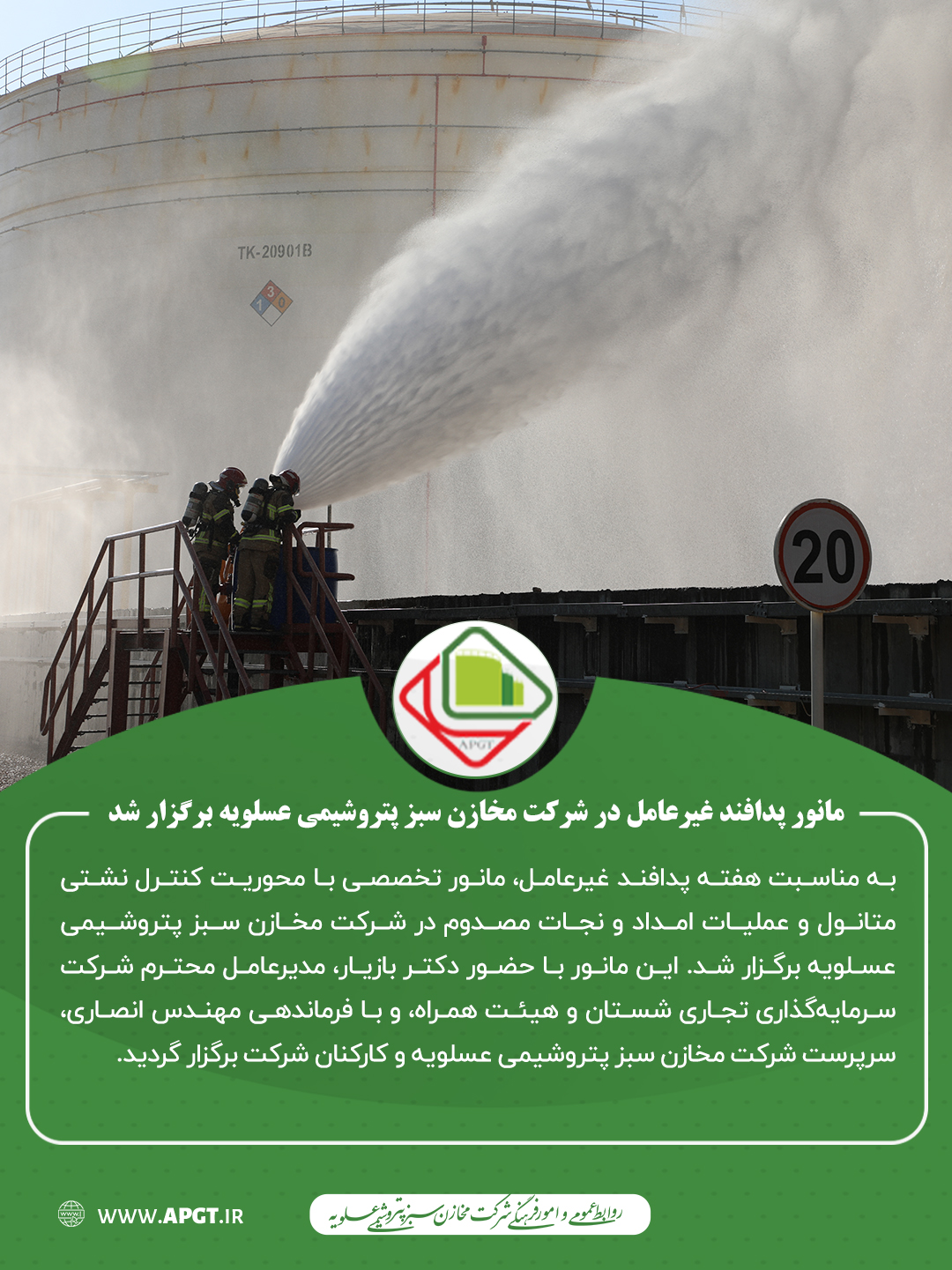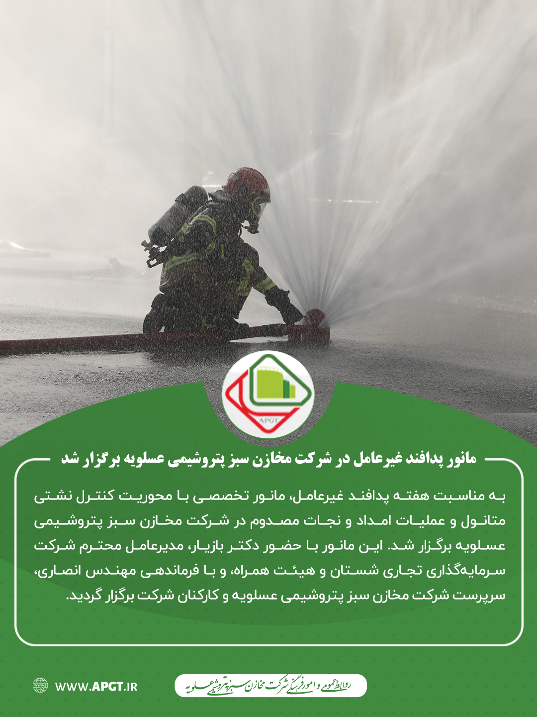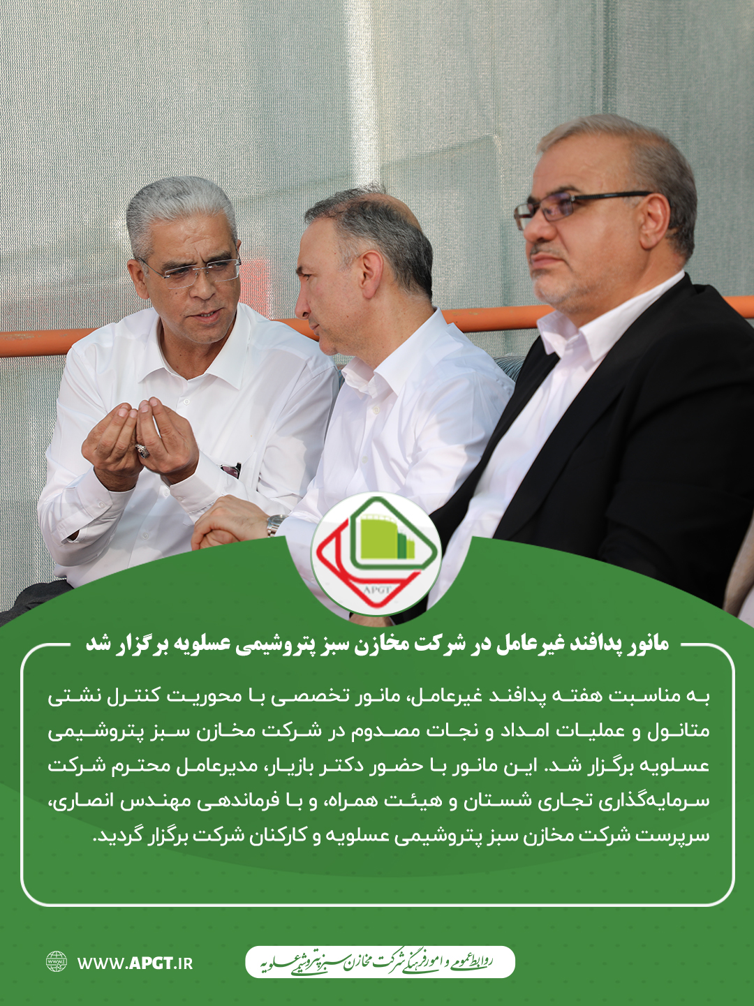مانور جلوگیری از نشت متانول و امداد و نجات مصدوم با حضور دکتر افشار بازیار مدیرعامل شرکت سرمایه گذاری تجاری شستان و به همت شرکت مخازن سبز پتروشیمی عسلویه در شهرعسلویه برگزار شد.