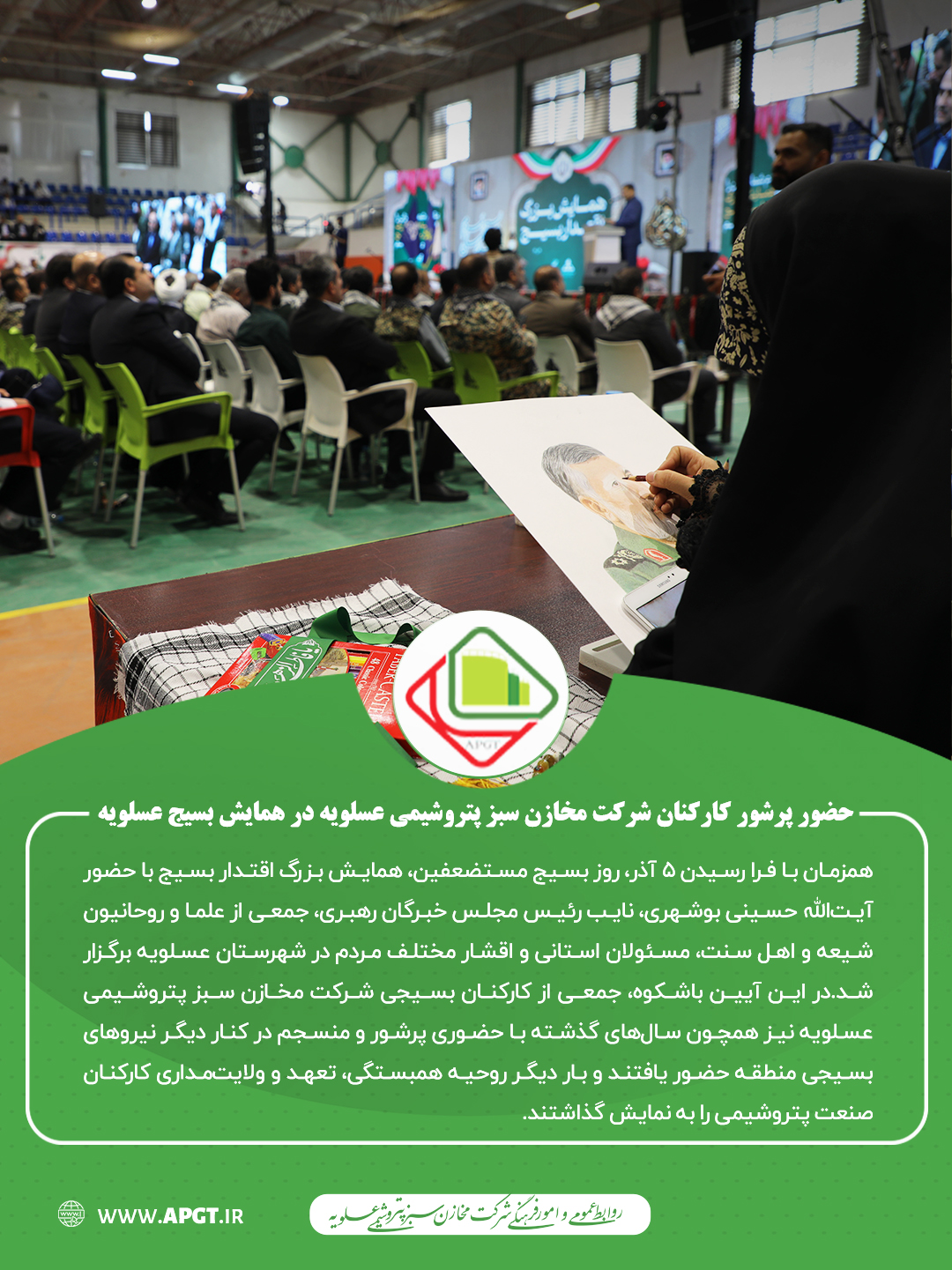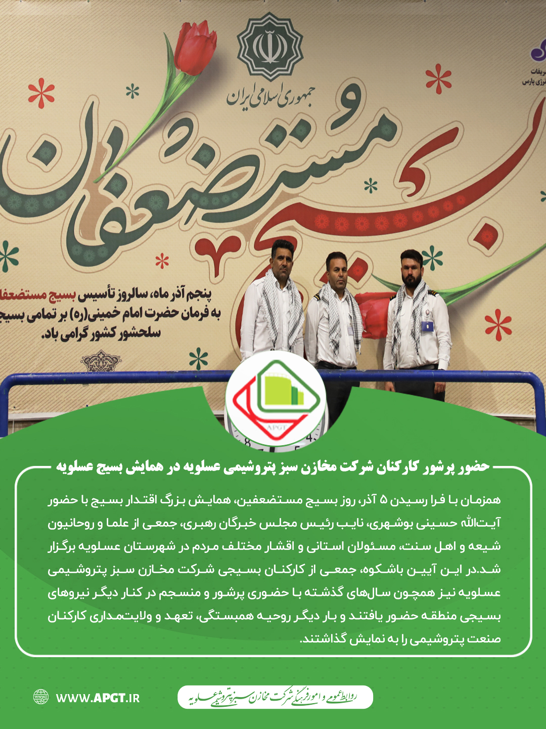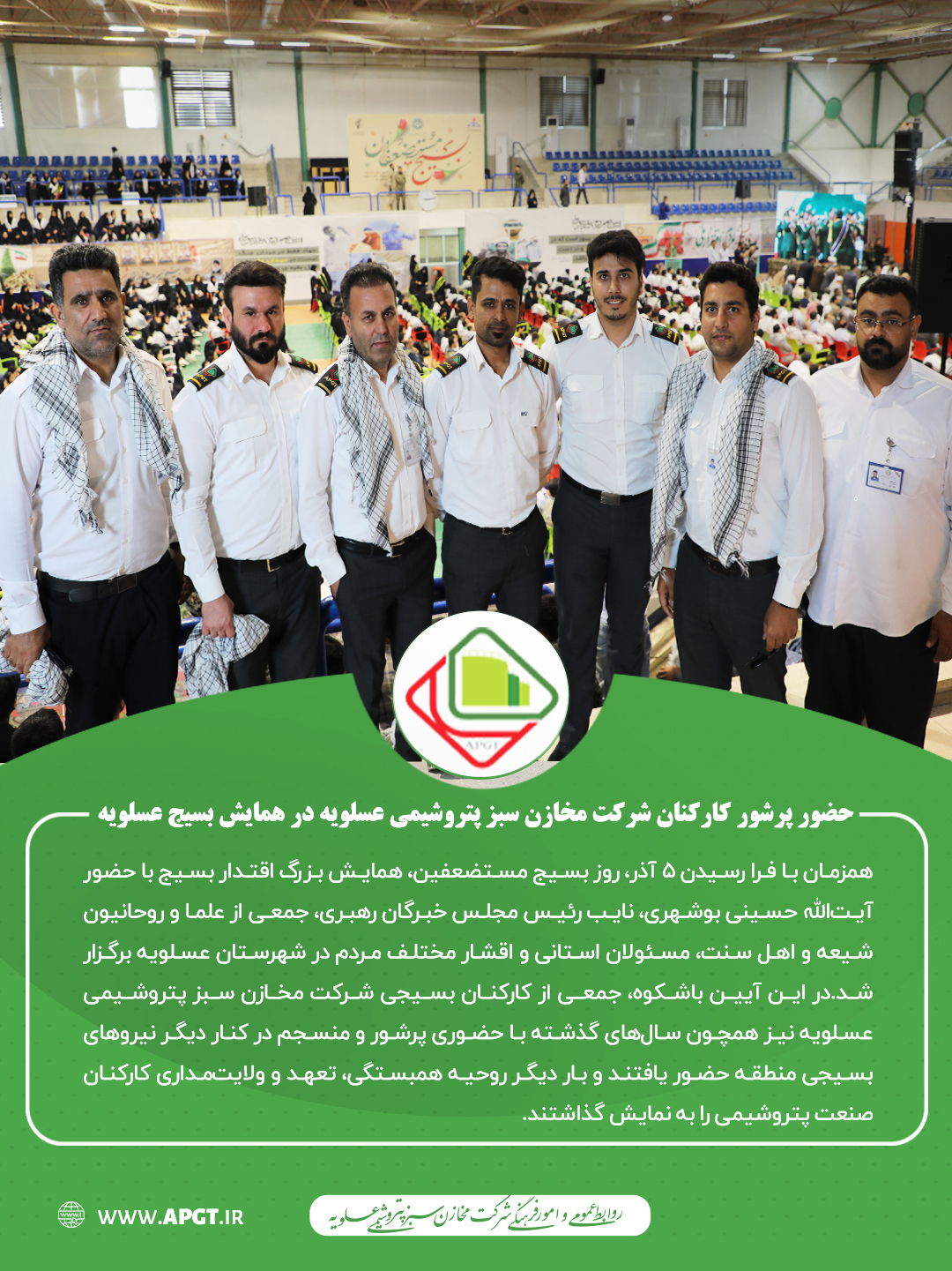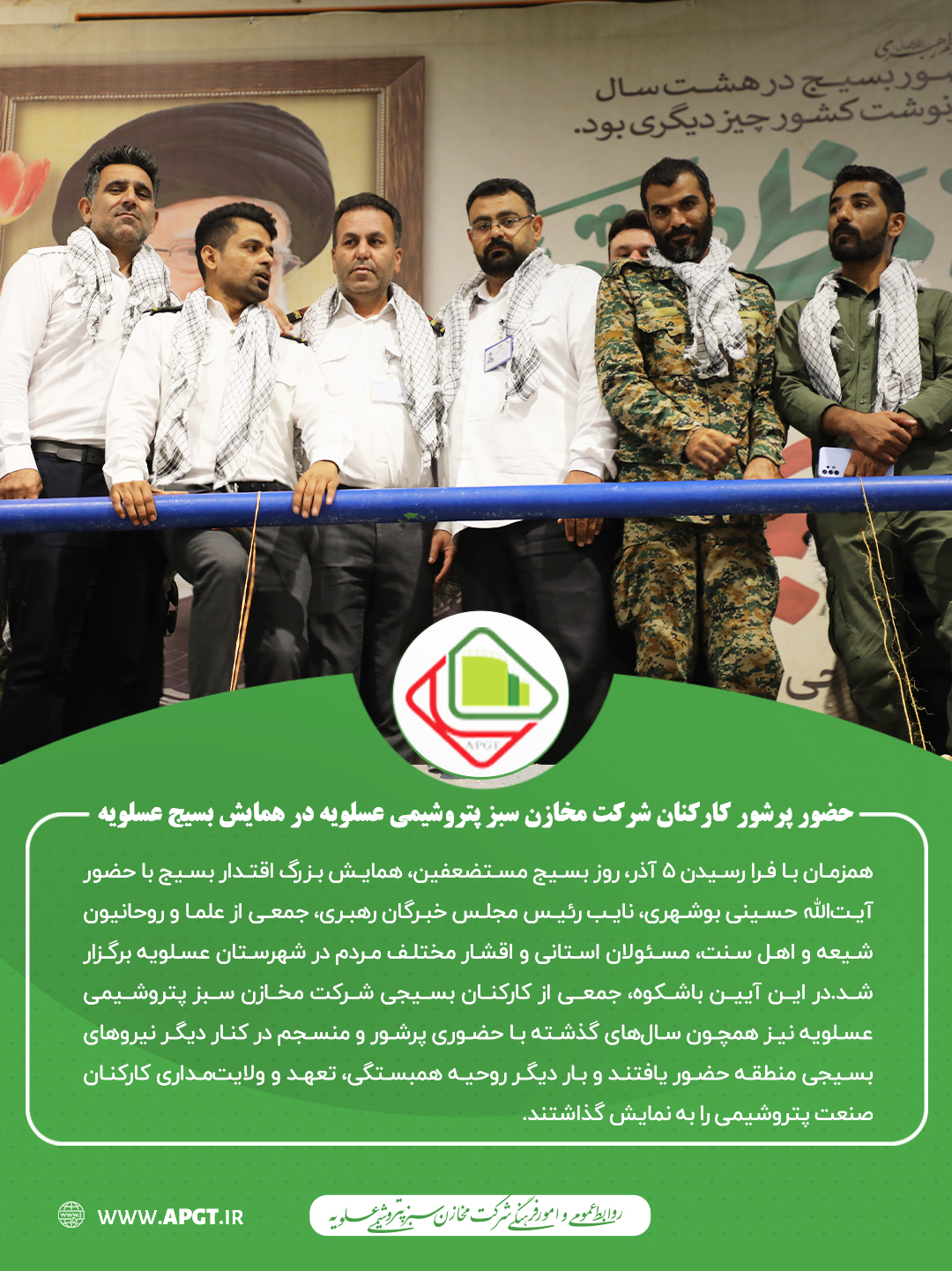 به گزارش روابط عمومی شرکت مخازن سبز پتروشیمی عسلویه، همزمان با فرا رسیدن ۵ آذر، روز بسیج مستضعفین، همایش بزرگ اقتدار بسیج با حضور آیتالله حسینی بوشهری، نایب رئیس مجلس خبرگان رهبری، جمعی از علما و روحانیون شیعه و اهل سنت، مسئولان استانی و اقشار مختلف مردم در شهرستان عسلویه برگزار شد.در این آیین باشکوه، جمعی از کارکنان بسیجی شرکت مخازن سبز پتروشیمی عسلویه نیز همچون سالهای گذشته با حضوری پرشور و منسجم در کنار دیگر نیروهای بسیجی منطقه حضور یافتند و بار دیگر روحیه همبستگی، تعهد و ولایتمداری کارکنان صنعت پتروشیمی را به نمایش گذاشتند.